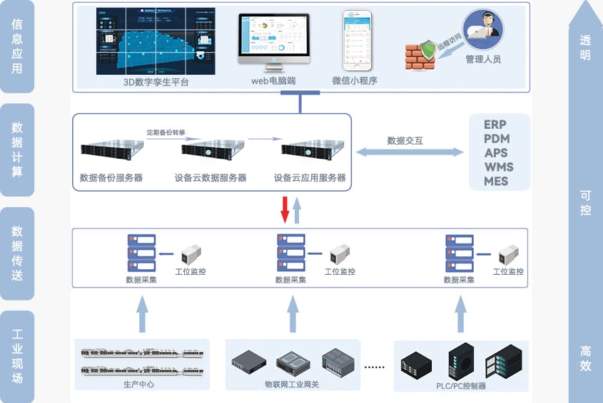 從人機界面到web界面再到小程序界面均可操作,實現業務層、執行層間的數據流通管理,滿足用戶在不同場景下的使用需求,讓用戶可以隨時隨地查看工廠的實時數據。