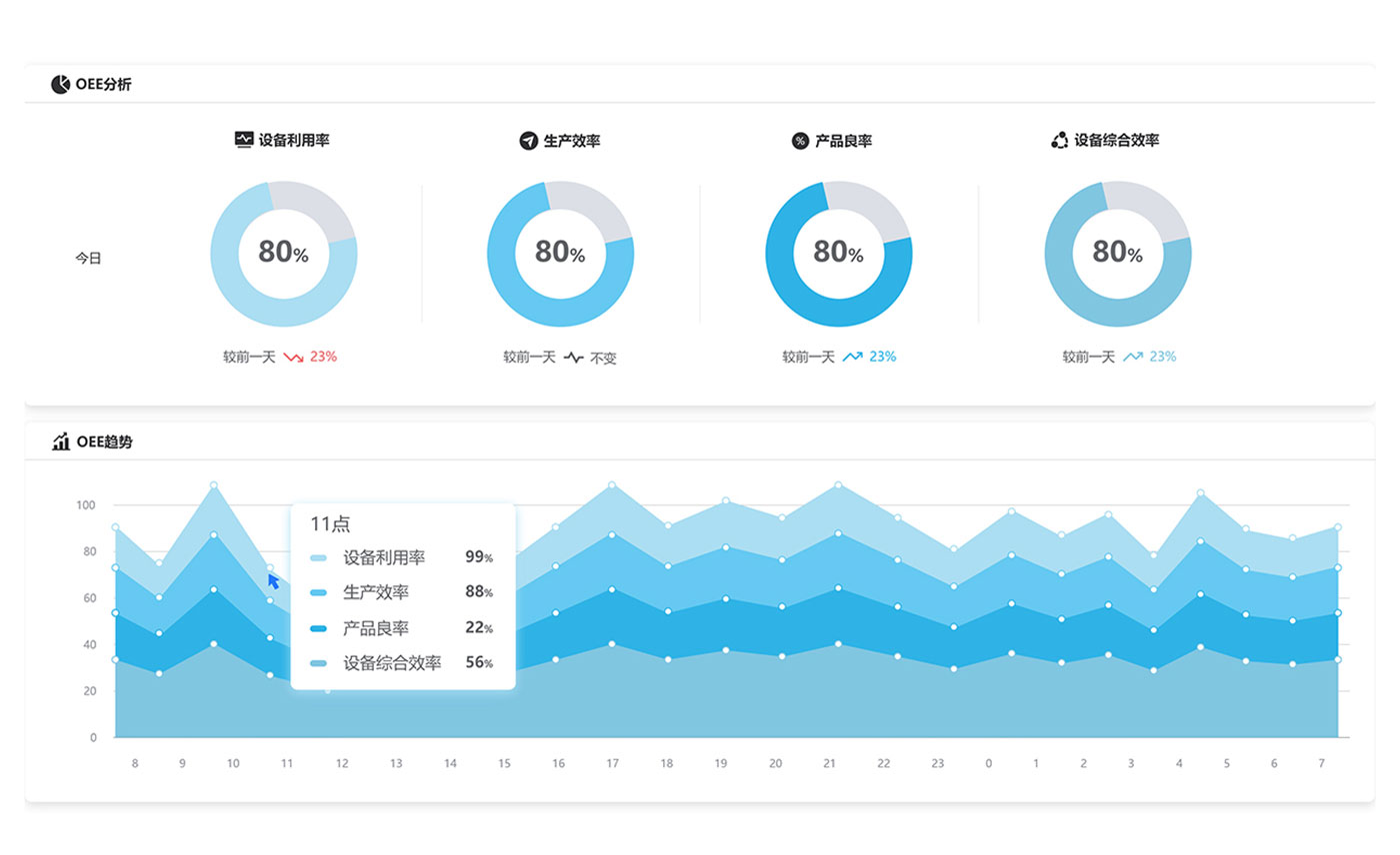 根據設備數據智能計算設備綜合效率(OEE),為提升設備綜合稼動率提供借鑒。